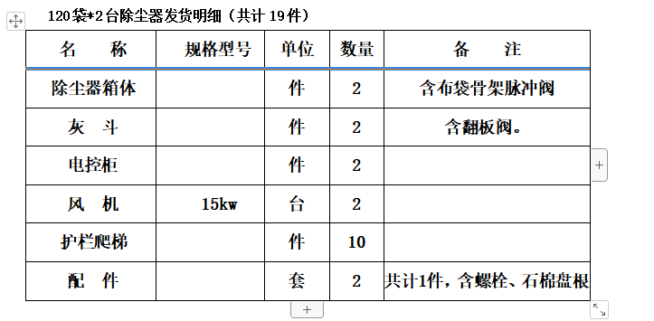 除塵器隨車發貨清單:
